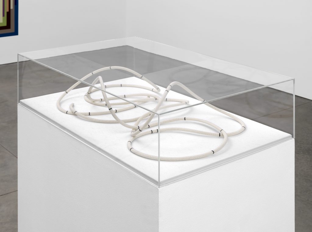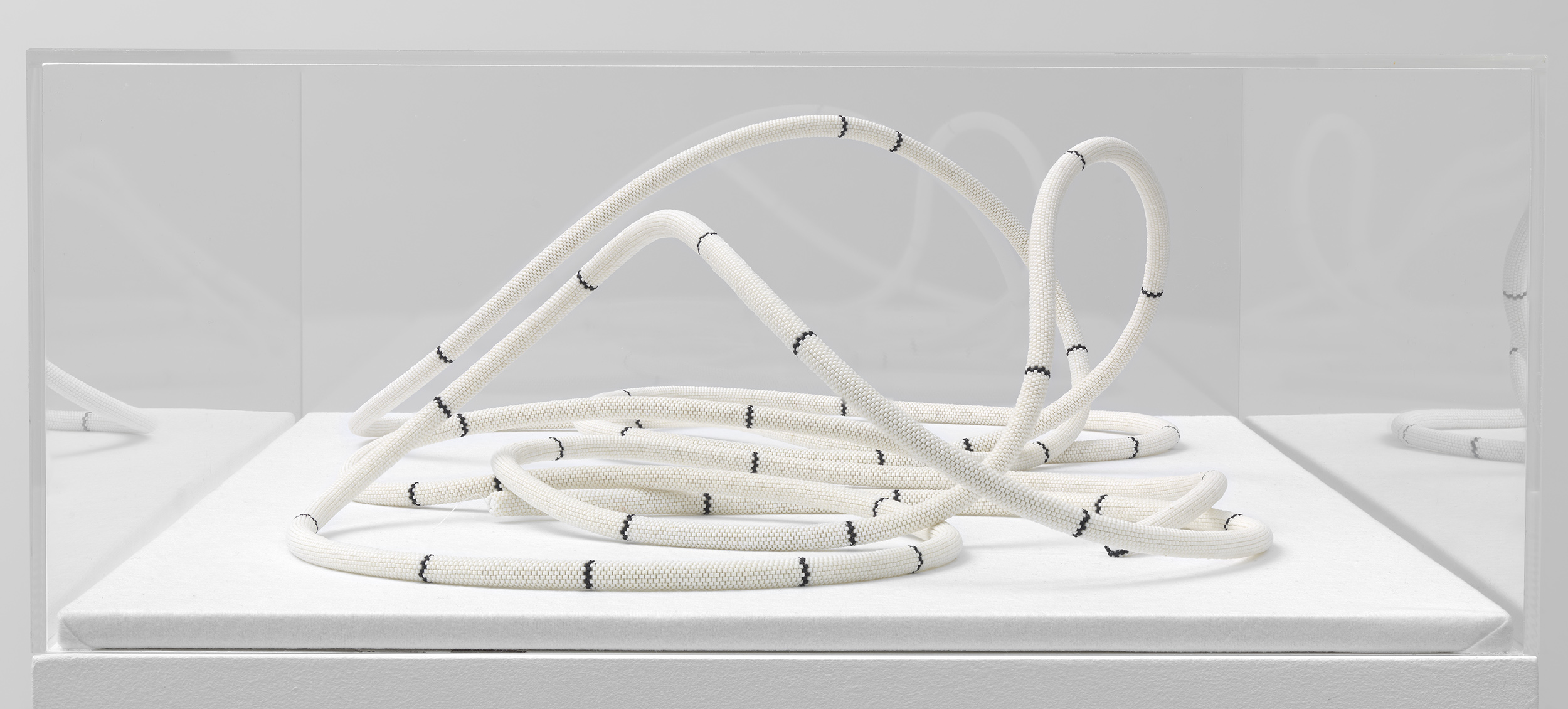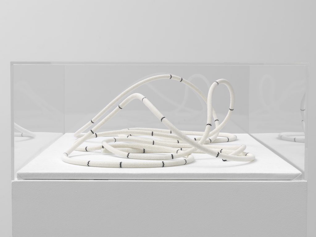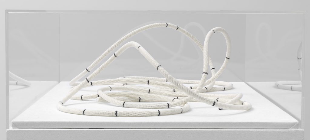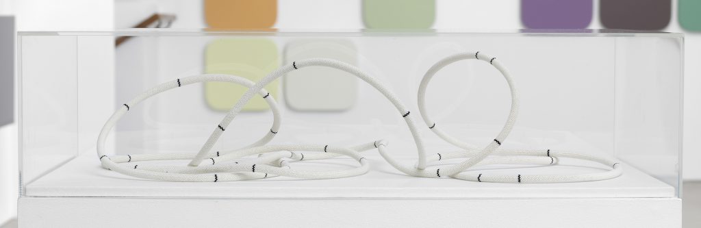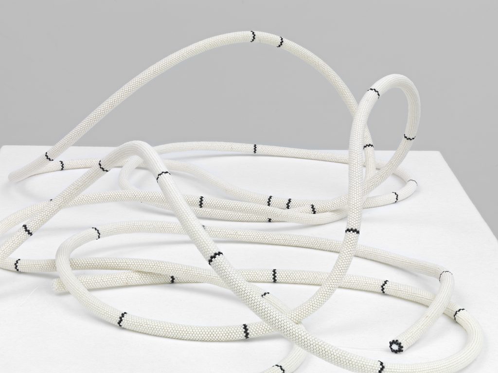 The project progresses during the artist’s “free time,” gradually filling these periods and, over time, beginning to generate its own measure of time. In this beaded structure, which advances approximately 3 cm per hour, each black ring marks the beginning of a new day, while the length of the white segments makes visible the amount of time devoted to this production on that particular day. In this way, the project transforms into a temporal weave that measures both its own time and the time that is transferred to it.