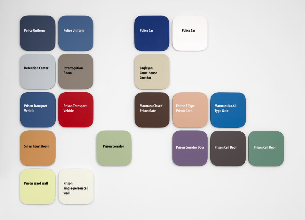 I didn’t like these colours! (2026) is drawn from the colours encountered by politicians, intellectuals and journalists in Turkey, who have been subjected to and faced a cycle of unjust detention. The installation presents this journey’s colour palette, composed of hues digitally sampled by the artists from social media and press images of police uniforms, police vehicles, detention centres, interrogation rooms, courthouse corridors, court rooms, prison gates, cell doors, and walls.